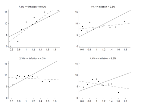 شکل 1 رابطه میان بازده مورد انتظار و بتا در محیطهای تورمی متفاوت را نشان میدهد [4]. براساس یافتههای این پژوهش، زمانی که تورم در محدوده پایین (زیر ۱٪) است، خط بازار سرمایه شیب تندتری نسبت به پیشبینی مدل CAPM دارد، اما در دورههای تورم بالا (۴ تا ۹٪)، این شیب بهطور محسوسی کاهش مییابد.