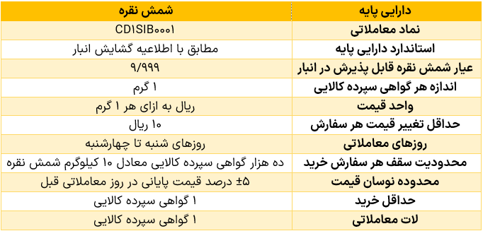 - هر گواهی سپرده کالایی شمش نقره معادل ۱ گرم از شمش نقرهی «یک کیلوگرمی» با «عیار ۹۹۹/۹ از ۱۰۰۰» است.